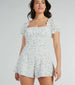 What could be sweeter than you in this floral romper? Play up your style in this must-have romper for the spring-to-summer season. The ruffle trim puff sleeves add a whimsical touch. while the form-hugging silhouette and tie-back detail create a flattering fit. With a short-length hem and a square neckline. this romper is flattering for any occasion! Complete the look in heeled sandals and hoop earrings.