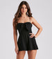 Create the sweetest look for parties or date nights with this adorable sleeveless romper! It features a subtle sweetheart neckline. a dramatic bow accent at the bust with a small keyhole cutout below. spaghetti straps. a fitted high waist. and flared-out shorts. The crepe fabric offers a moderate stretch. Complete the outfit with clear heels.