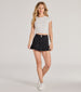 This denim mini skirt features a flattering high-rise waist and pleated hem for added flirty flair. Perfect for styling with a basic tee and sneakers.