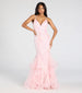 Your stylish glow will be undeniable in the Sylvia sequin formal dress for a glamorous entrance into prom or black tie events! The V-neckline and padded bra cups offer flattering support while the wired insert creates a structured silhouette. Adjustable spaghetti straps and lace-up back lets you customize the sultry style. Embellished with a sequin scroll pattern on mesh fabric. the dress is finished with tulle ruffle inserts with bonded edges for a stunning floor-length effect! Complete the look with a gorgeous rhinestone headband and clutch.