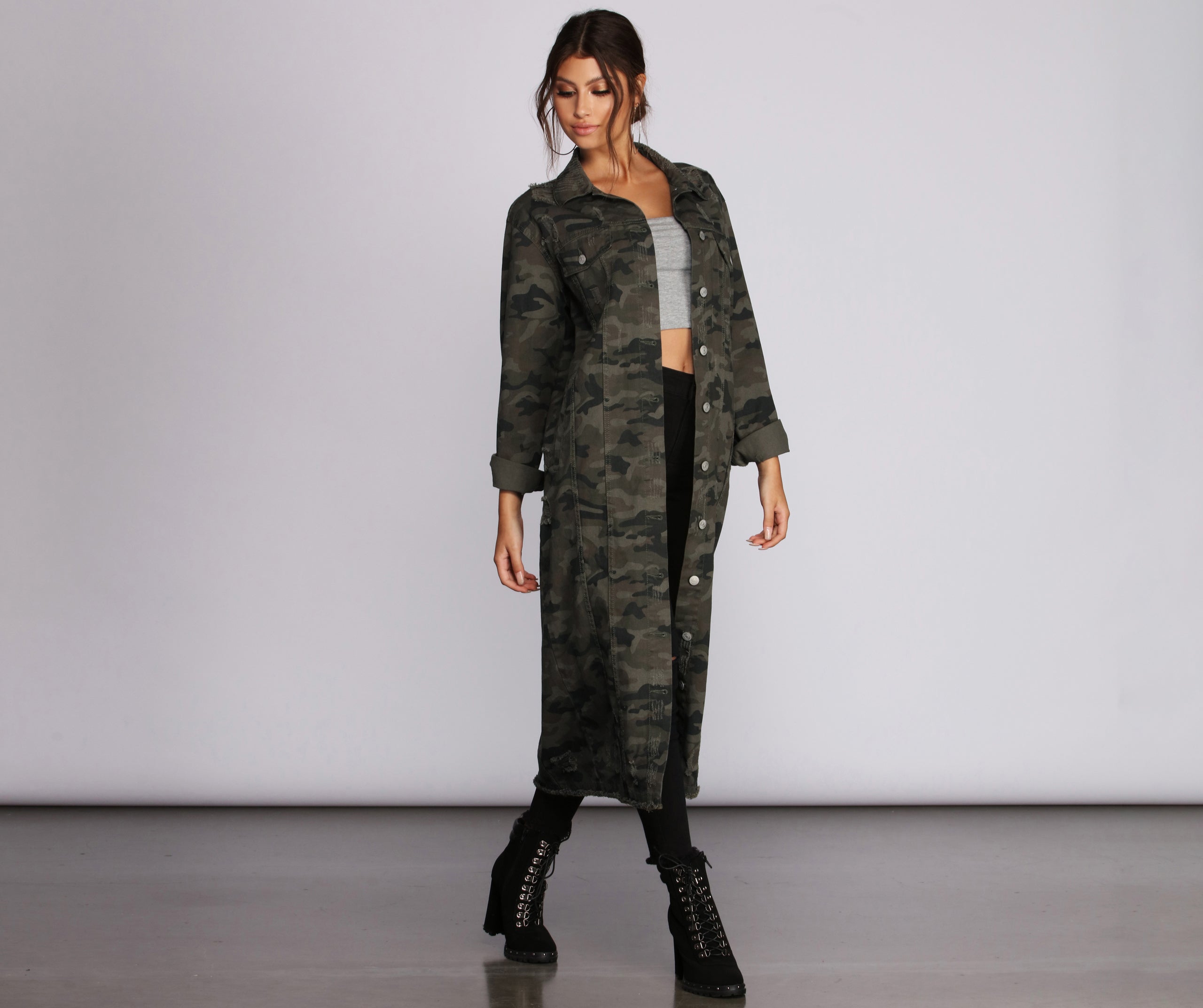 Yes girl. you came to take charge and slay every step in this trendy camo jacket! It features a collar. long sleeves with buttons to cuff. top pocket detailing. a complete button down front. slight all over distressing. and a frayed hem. The long line jacket showcases a camouflage print and offers a relaxed fit.