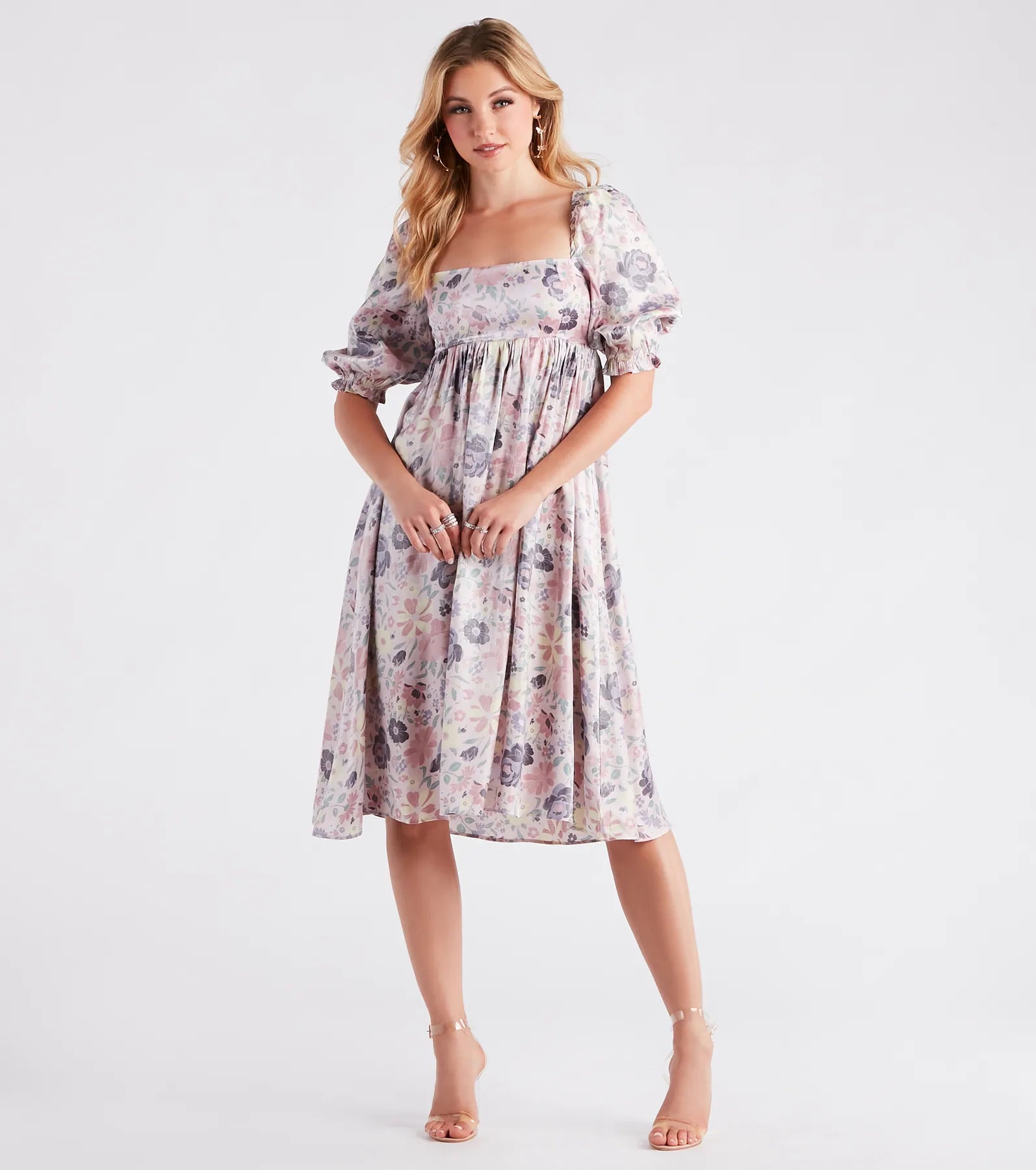 Everyone will be taking in the beauty of you in this whimsical floral satin midi dress perfect for outdoor weddings or chic garden parties! The dress features three-quarter length sleeves with elastic cuffs. a square neck. a stretchy smocked back. and a flowy silhouette. Complete the look in pretty butterfly hoop earrings.