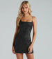 Take the night by glitter in this sparkling mini dress perfect for a shimmering night out! Featuring a sleeveless square neckline. bungee spaghetti straps. an open strappy back. and a flattering bodycon silhouette and mini-length hem. Complete the look in chic block heels.