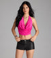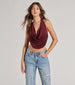Take the plunge and dare to show skin in this sleeveless halter crop top for a night out! Featuring a halter cowl neckline with bar trim. an open back. and a stylish crop hem. this top is perfect for standing out and making a statement. Complete the look in sleek faux leather pants.