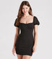 Your honey will be taken by the view of you in this sassy crepe dress on date nights and cocktail soirees! It features adorable chiffon puff short sleeves. a sweetheart neckline. a structured bust. and a bodycon mini-length hem. Complete the look with an glitter box clutch and heels.