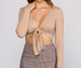 Take it easy in this casual top that is perf for your casual mood. The top features a notched V-neckline. long fitted sleeves. and a tie front bodice. The top is composed of a knit fabric that offers a form-hugging fit with plenty of stretch. Complete the look with a plaid mini skirt.