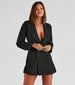 This blazer romper is all about business in the front and sultry in the back! It features long sleeves. a lapel collar plunge neckline. double-breasted button closures. an open-back. and a short-length hem. Complete the look in a sleek necklace and heels.