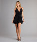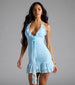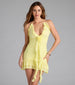 Get ready to turn heads in this mesh mini dress! The ruffled floral trim halter neckline adds a touch of elegance. while the bodycon silhouette and mini-length hem accentuate your curves.