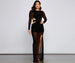 Bring the sparkle to your evening with a formal dress that radiates shine from all your best angles! Tayla features a crew neckline. long sheer sleeves. a cutout at the waist with a bar strap. a partially lined A-line silhouette with a high side slit. and luxe heat stones throughout. The dress is composed of a partially lined mesh fabric that offers a form hugging fit with a moderate stretch. Complete look with rhinestone hoops and heels.Â