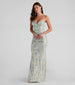Catch all the glances in the gorgeous illuminating Teagan formal dress! She features a sleeveless wrap-front sweetheart neckline. padded cups that eliminate the need for a bra. and adjustable spaghetti straps for a customizable fit. Her empire waist leads to a floor-length slim-fit silhouette. The lined mesh fabric showcases all-over iridescent sequin embroidery in a gorgeous damask design. Complete the look with a sparkly clutch.