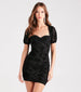 The perfect LBD for a dressy date night. the Terra flocked velvet mini dress will bring that chic flair. She features a sweetheart neckline with a build-in padded bust and center ruching. sheer short puff sleeves. ruching down the side and back seams. a mini-length hem. and a bodycon silhouette that will hug your natural curves. The lined mesh fabric features a floral flocked velvet pattern. Style with lace-up heels.