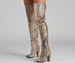 Set the chic standard in boots that elevate your outfit. The boots feature a faux snake print. an inner zipper closure. a pointy toe. block heel. The boots are composed of a faux leather material. Complete look with a cardigan and mini skirt.