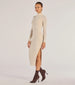 The ribbed knit dress features a turtleneck. fitted long sleeves. and a midi-length hem accented with a high side slit. Pair it with ankle booties to complete the look.Â