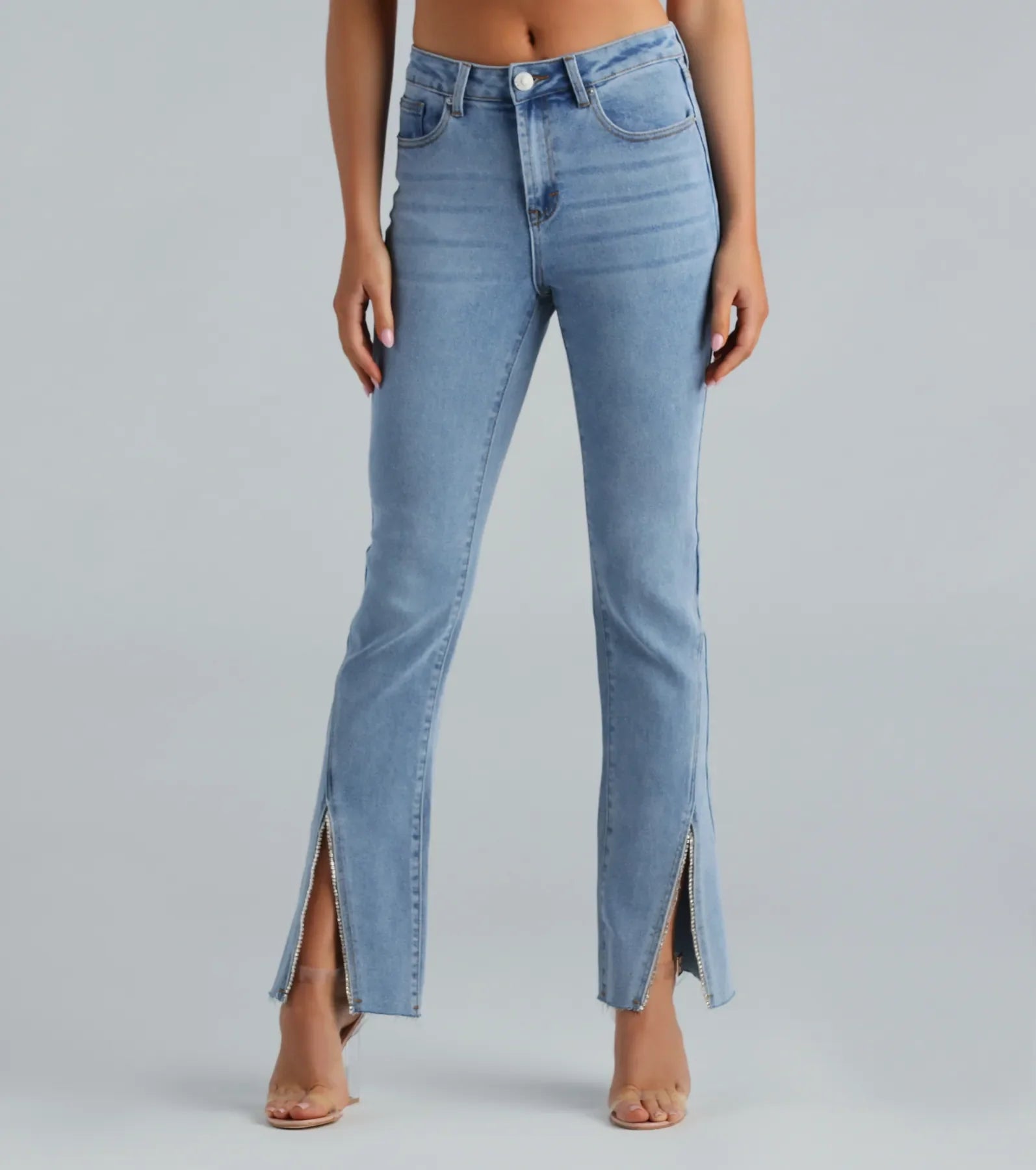 Give yourself the glam treatment in these high-rise denim jeans! They feature a flattering high-rise waist. a hip-hugging fit. and a flared hem with an asymmetrical seam that leads to a center slit with rhinestone trim. The jeans are crafted from medium-wash denim fabric that offers a slight stretch and a color fade for a vintage effect! Style the denim jeans with a blinged crop top and heels for a birthday or night out!
