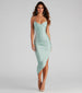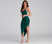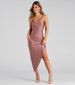 Impress in a sleek minimal midi dress the next day you head out for a girl's night out with the squad or for a date night with bae. The midi dress features a plunging V-neckline. a dramatic asymmetrical high slit. and ruched detailed side seams to enhance curves. Complete your look with clear heels and a dainty lariat necklace.