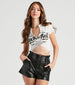 Flaunt your original status as a rock babe in this edgy graphic tee featuring short sleeves. a crew neck with a V-cut notch. a slashed hem. and a front script that reads. "The Original Rock N Roll". Complete the look in sleek faux leather shorts for a concert!