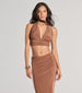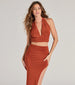 A crop top features a sultry plunge halter neckline and open back to reveal plenty of skin. Perfect for weekend plans.