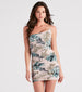This tropical mini dress will put you in vacay mode! Flaunt some skin in this sleeveless one-shoulder dress featuring a sleek bungee spaghetti strap. side ruched seams to accentuate your curves. and a bodycon fit. The dress is designed with a palm leaf print on stretchy knit-lined fabric. Complete your getaway look in platform wedges.