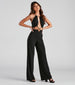 You may be at the hottest spot in town but you'll be the one raising the heat in this sleeveless halter jumpsuit featuring a front keyhole cutout. tie-back neck closure. high-rise waist. wide-leg silhouette. and a racerback design with a cutout. Complete the look in statement earrings and a clutch.