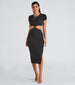 You've got knit on the mind. show off in a midi dress that stuns! The dress features a crew neckline. short sleeves. a knot accent at the center with dual cutouts at the waist. and a midi-length silhouette that is accented with a high side slit. The dress is composed of a cotton knit fabric that offers a form-hugging fit with a moderate stretch. Complete look with mules and a clutch.