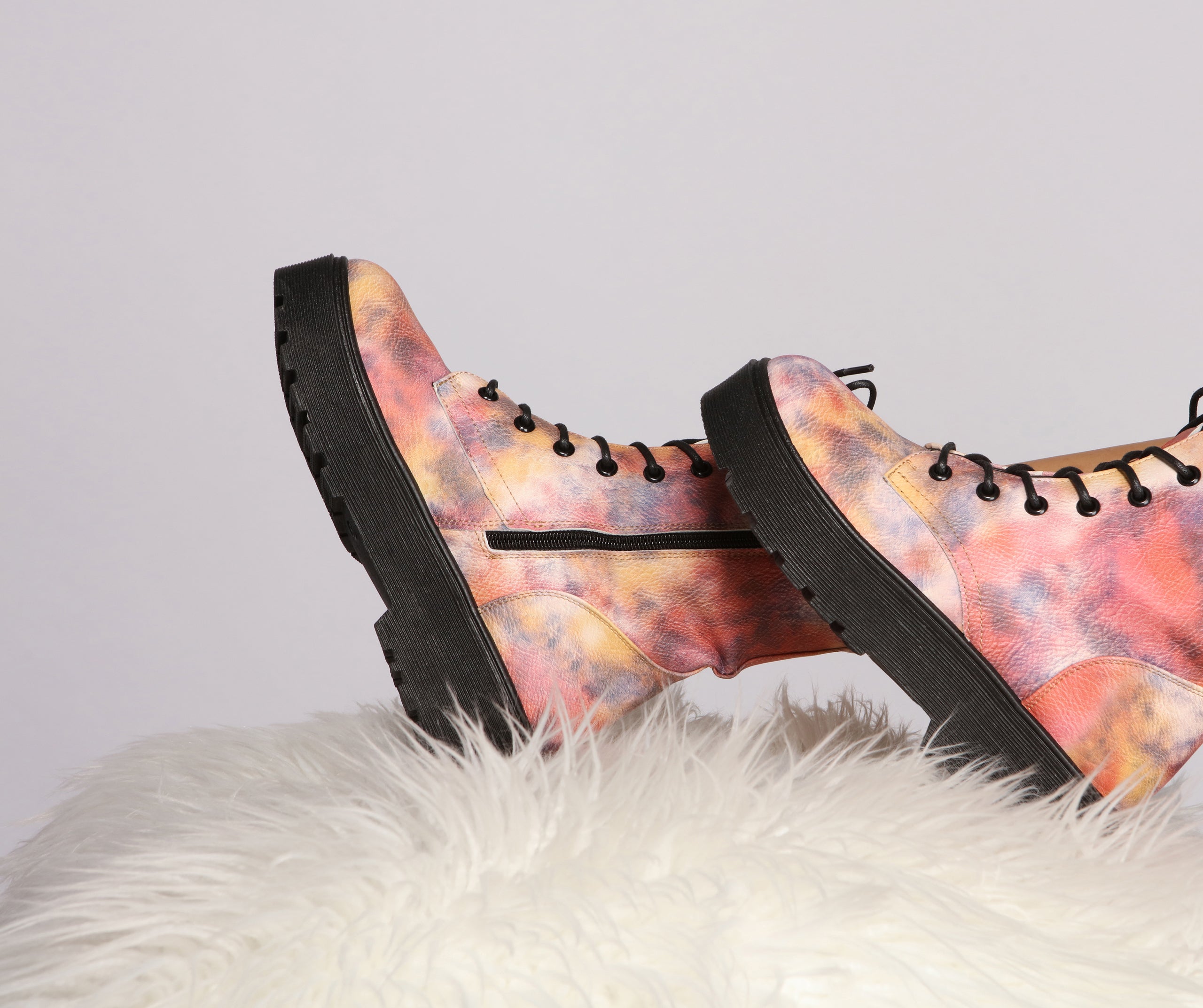 These booties are part edgy and part bohemian to make them a true one of a kind! The booties feature a bright multicolored tie-dye pattern. a lace-up front. and a lug sole. The boots are composed of faux leather material. Complete your look with an oversized basic tee and biker shorts.