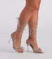 It's always time for glitz and glamour! Style up these gorgeous clear heels for your next dressy party. They feature an open square toe. a clear PVC strap with a rhinestone bow and a center rhinestone adorned accent. a strappy lace-up design that wraps around the leg with rhinestone embellishments. and a clear stiletto heel with a flat geo-shaped bottom. The heels showcase a chic chrome sheen for even more shine. Pair with a sleek clutch.