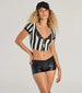 Call the shots as a chic referee this Halloween in a stretchy knit crop top that features a plunging square neck with scalloped lace inset trim. short sleeves. and a black and white striped pattern. Complete your costume with the matching hot shorts. rhinestone whistle. football rhinestone clutch. and over-the-knee socks.