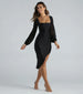 It's time to allure and create a captivating sultry 'fit with this asymmetric midi dress! It features a square neckline. long sheer mesh balloon-style sleeves. a midi-length asymmetric hem creating a chic high-cut side slit. and a form-hugging silhouette. The smooth knit fabric offers plenty of stretch. Complete your dressy night-out look with lace-up heels.