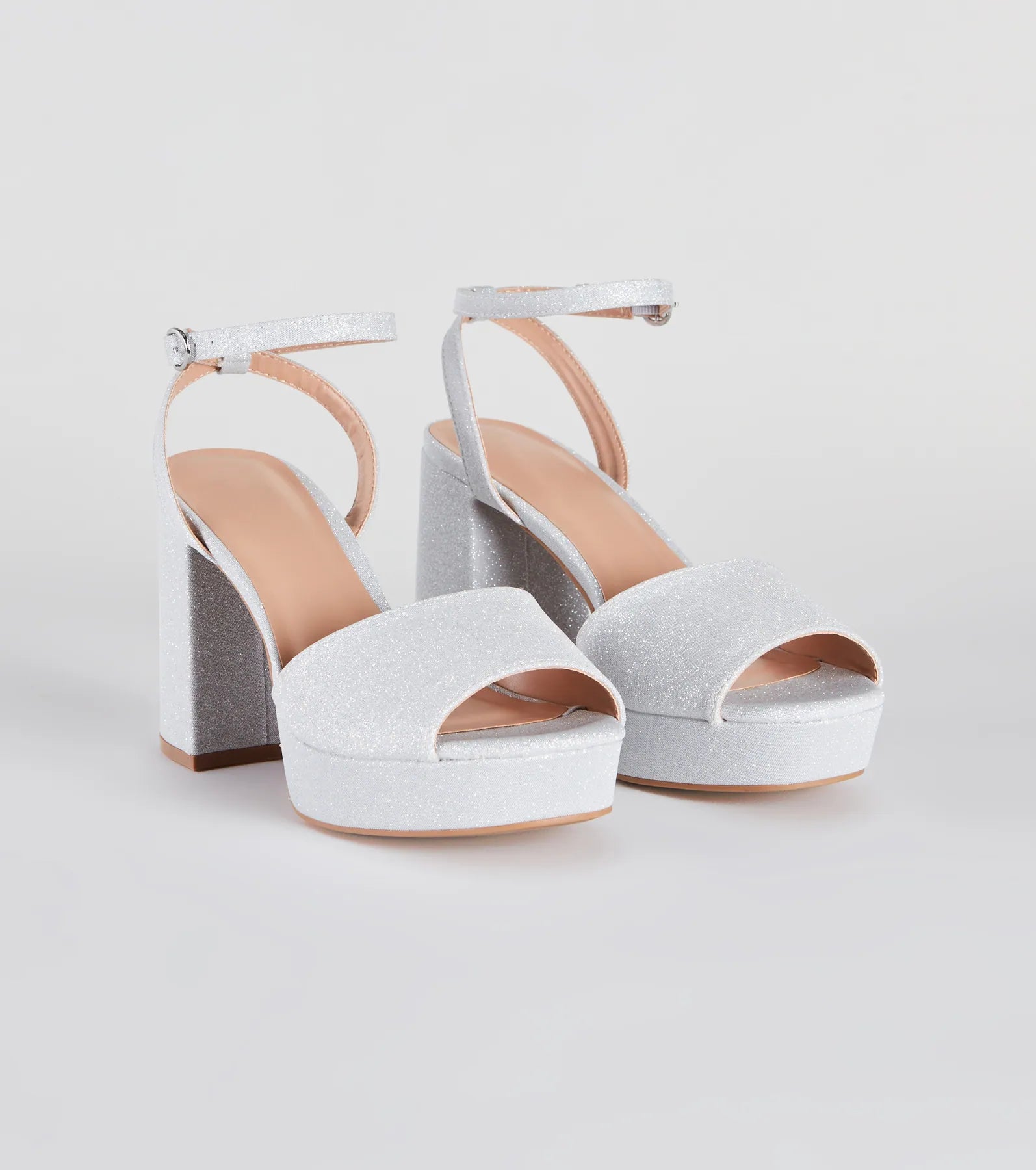 It will be your time to shine in these glitzy and glamorous glitter platform heels! They feature an open round peep toe with a wide banded toe strap. thin adjustable ankle and heel straps. a platform sole. and a tall thick block heel for a dramatic vibe. The heels feature a glitter mesh exterior and a faux leather subtle cushioned insole. Style with a metallic clutch.Â
