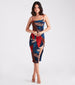Take time to relax and unwind on your next vacation...in this stylish tropical midi dress! It features a sleeveless square neck. spaghetti straps. a bodycon fit. and a front slit accent on slinky knit-lined stretchy fabric. Complete the look in cute platform wedges.