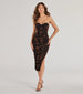 Showcase timeless beauty in this midi dress designed with lined mesh fabric and a gorgeous flocked velvet floral pattern. It features a strapless sweetheart neckline with a structured bust. ruched detailing to accentuate your stunning curves. and a high-cut side slit accented on the mid-length bodycon silhouette.