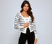 Keep it chic in timeless stripes that are always on trend! The cardigan features a V-neckline. a button-down front. long sleeves. and a horizontal striped pattern. The cardigan is composed of a cable knit fabric that offers a relaxed fit with a moderate stretch. Complete look with the matching tube top.