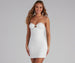Channel timeless glamour with a short dress that radiates elegance. The dress features a sleeveless sweetheart neckline. molded padded cups. underwire to offer additional support. a small cutout at the center of the bust. rhinestone trim. and matching rhinestone spaghetti straps. The slim-fit bodice leads to a curve-hugging short hem. The dress is composed of a lined ponte knit fabric that offers a moderate stretch. Complete look with rhinestone heels and a faux fur wrap.