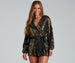 Make a toast to glamour with a sequin romper that brings major glitz. The romper features iridescent sequins. a plunging wrap V-neckline. partially sheer long sleeves. a tie-waist belt. and wide-leg shorts. Complete look with a sphere clutch and mules.
