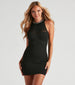 Tonight's vibe is all about this edgy-chic mini dress featuring a sleeveless mock neck with a chain link trim. mesh bust and lightly padded cups. and a bodycon silhouette. Complete the look in mules.