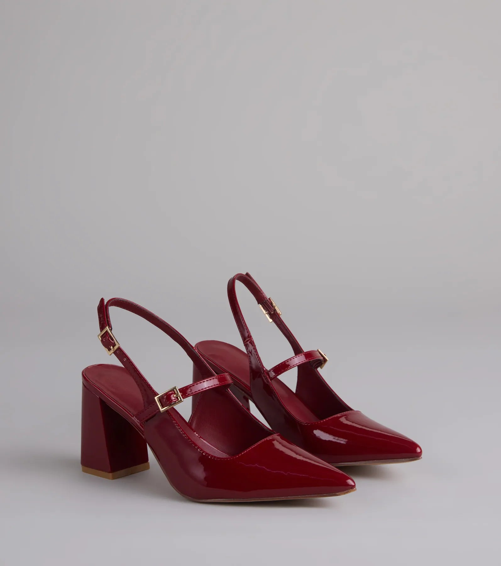 She's giving vintage chic with a modern twist. These patent faux leather sling-back pumps are all about that buckle detail. block heel. and padded insole comfort you'll want from day to night.