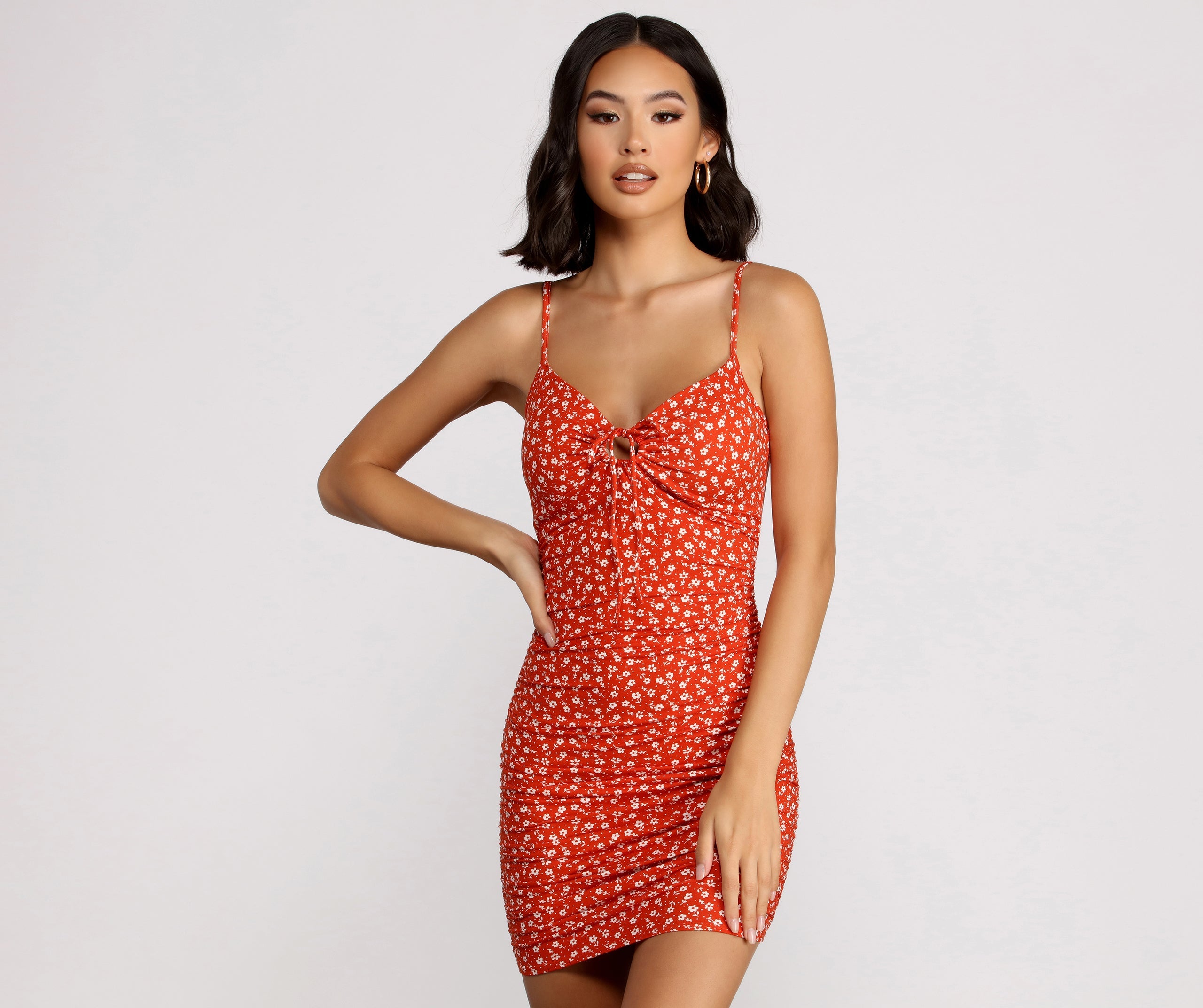 You'll look too sweet in a floral dress that brings the charm. This pretty date-night dress features a sweetheart neckline. a tie front accent. and a ditsy floral print. Complete your look with a light wash denim jacket and wedges.