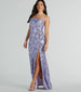 Beautifully embellished with sequins in scroll patterns. the Tori formal dress captivates everyone at prom or banquets! She's designed with an elegant cowl neckline and adjustable spaghetti straps so you customize the fit. while the mermaid silhouette flaunts your hourglass. and high front slit adds a touch of allure perfect for any formal occasion. Style the gown with earrings. a clutch. and heels for an unforgettable evening look!