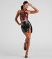 Look and feel like a total baddie wearing this edgy PU mini skirt designed with a high-rise waist. back zipper closure. a bodycon silhouette. and a front slit with dual chain trim. Complete the look in a long sleeve crop top and heels.