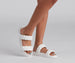 Look and feel so cute in these slide-on sandals perfect for a beach day! they feature an almond toe. dual braided strap design. slide-on fit on PU material. Complete the look in classic denim shorts.