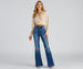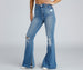 Elevate your everyday style in these distressed high-rise jeans. They feature a high-rise waist. a straight leg with flared hem. distressing throughout. and slits at hem. The jeans are composed of a combination of cotton denim and spandex fabric that offers a form hugging fit with minimal stretch. Complete the look with a crop sweater and hoops.