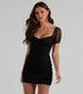 Create a sweet moment with a mini dress that brings the charm! The dress features a sweetheart neckline. short puff sleeves. ruching throughout to enhance curves. and a mini-length silhouette. The dress is composed of a lined mesh fabric that offers a form-hugging fit with a moderate stretch. Complete the look with mules.