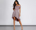 Go ahead and take this dress for a spin! This flirty skater style is made for stealing the spotlight wherever you go. The glitzy dress features a flattering off the shoulder neckline. a twirly high low skater-styled silhouette. and an-all over glitter composition. Complete your glamourous outfit with gleaming rhinestone earrings and metallic heels for head to toe shine.Â