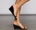 Keep it totally chic with wedges that elevate your outfit. The wedges feature an open back. a clear PVC strap. an open almond toe with a strap over the toe. and a faux croc-embossed wedge heel. Complete look with a ruffled midi dress and a shoulder bag.
