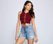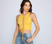 Keep it totally chic with a lace-up top to pair with your favorite high waist jeans! The top features a sleeveless crew neckline. a lace-up bodice. and a cropped hem. The top is composed of a ribbed knit fabric that offers a form hugging fit with a moderate stretch.Â