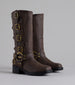 Step into these edgy statement faux leather boots with a buckled side accent and a calf-length fit perfect for pairing with bottoms or dresses.