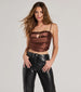 Level up the trend factor of your night out look in this satin crop top featuring a sleeveless cowl neckline with a sleek buckle trim. a sultry bust cutout. adjustable spaghetti straps for a customized fit. and an asymmetric cropped hem. Style with faux leather pants and mules!