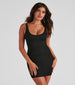 Simple and sleek. this bodycon mini dress is a trendy basic! It features a sleeveless scoop neckline. tank shoulder straps. and a short. curve-hugging silhouette. Style with strappy mules and a faux leather clutch.