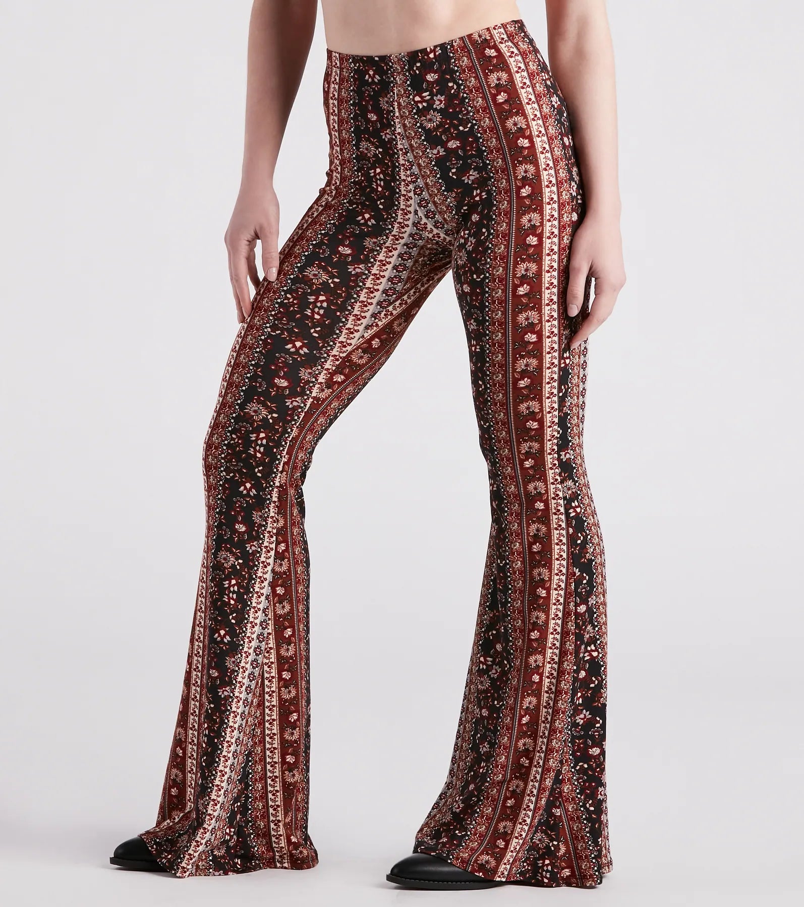 You'll be the trendiest gal at the festival or concert in these boho flare pants! They feature a flattering high-rise elastic waist. a hip-hugging fit. and a flared hem. The pants are designed with a floral striped print on stretchy brushed knit fabric. Complete the look in a crochet top and a hat.