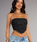 Serve trendy girl energy in this strapless denim corset crop top featuring a lace-up back and a V-cut hem for a snatched look.